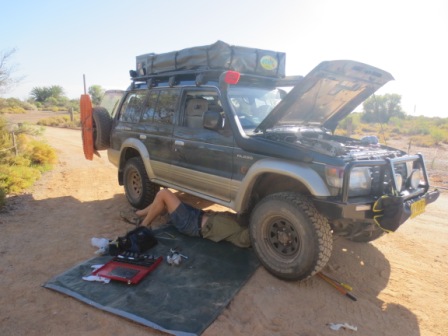 I went through all the possibilities in my mind. OK that battery is good – check, the car worked last night – check, the power was going to the starter – check (I could hear the solenoid throwing the starter into the flywheel), so it’s the starter motor. The corrugations from the day before must have killed it. This seemed sensible enough answer even though the starter was only 3 month old. It must be a defective one. Luckily enough Sydney City Mitsubishi had provided me with a spare, this was a must have as the car being an automatic can’t be towed easily and can’t be bump started. With this in mind I told Sophie that I will change the starter motor and we will be off in no time. I cracked on jacking the car up and got to work. Soph went to fetch help from the quickly disappearing campers that were all trying to get off before the heat and flies arrived.