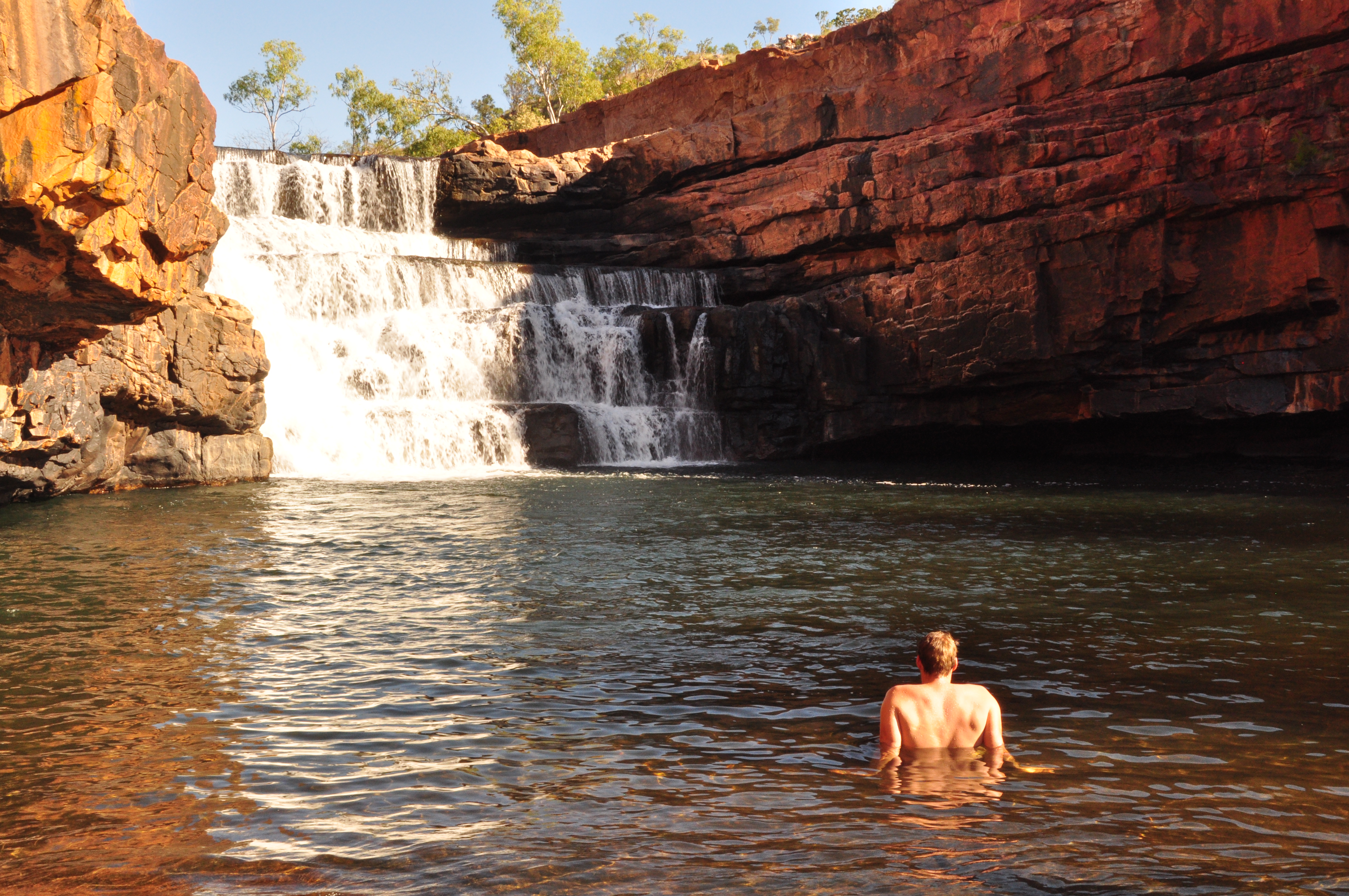 Feeling rather sheepish after the incident we were up early and out of the camp not long after sunrise, walking the track up to Manning Gorge waterfall. It took about an hour, but after the hot and sweaty walk we were rewarded with the most amazing waterfall. We spent the morning swimming and Rich regressed to schoolboy age, daring himself to jump off higher and higher rocks into the waterfall – each time surfacing with bigger and bigger grins – haha such a kid!