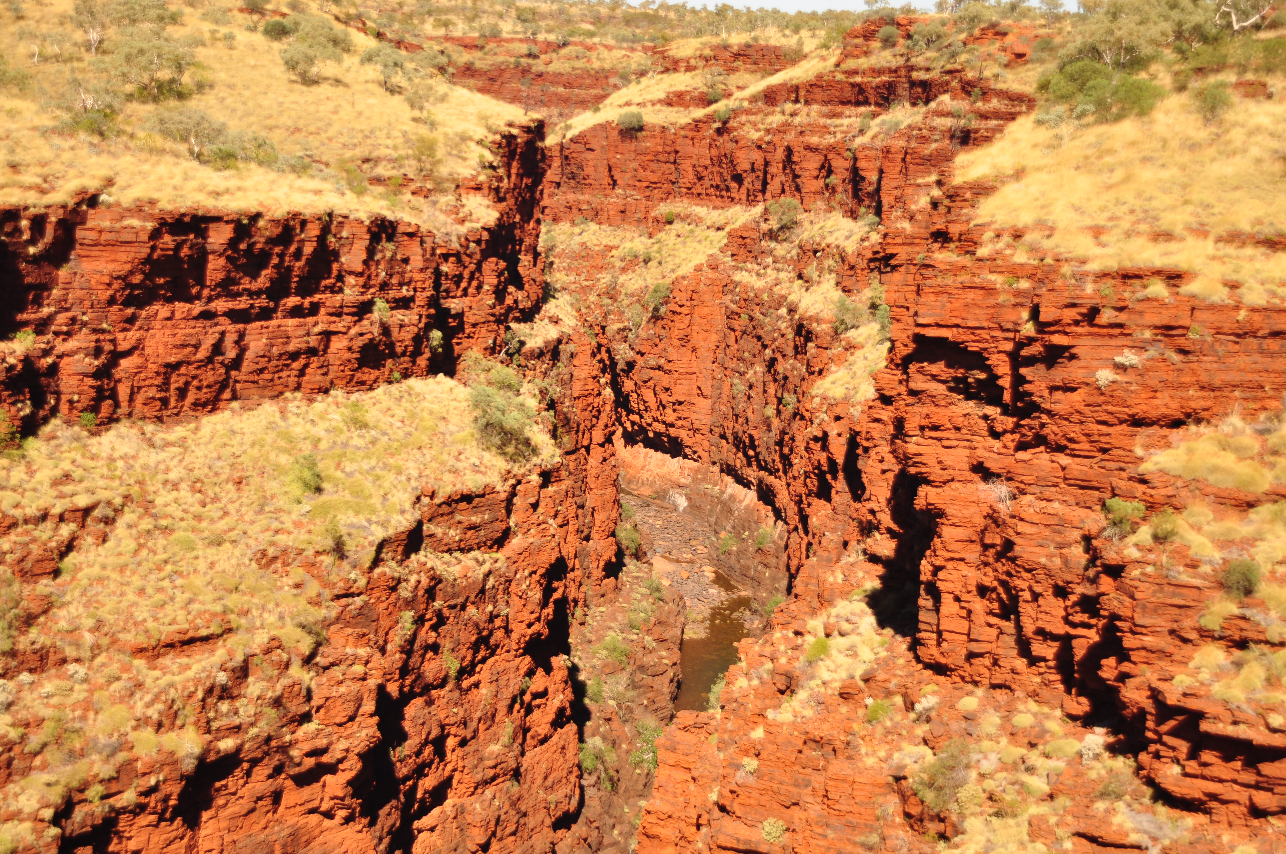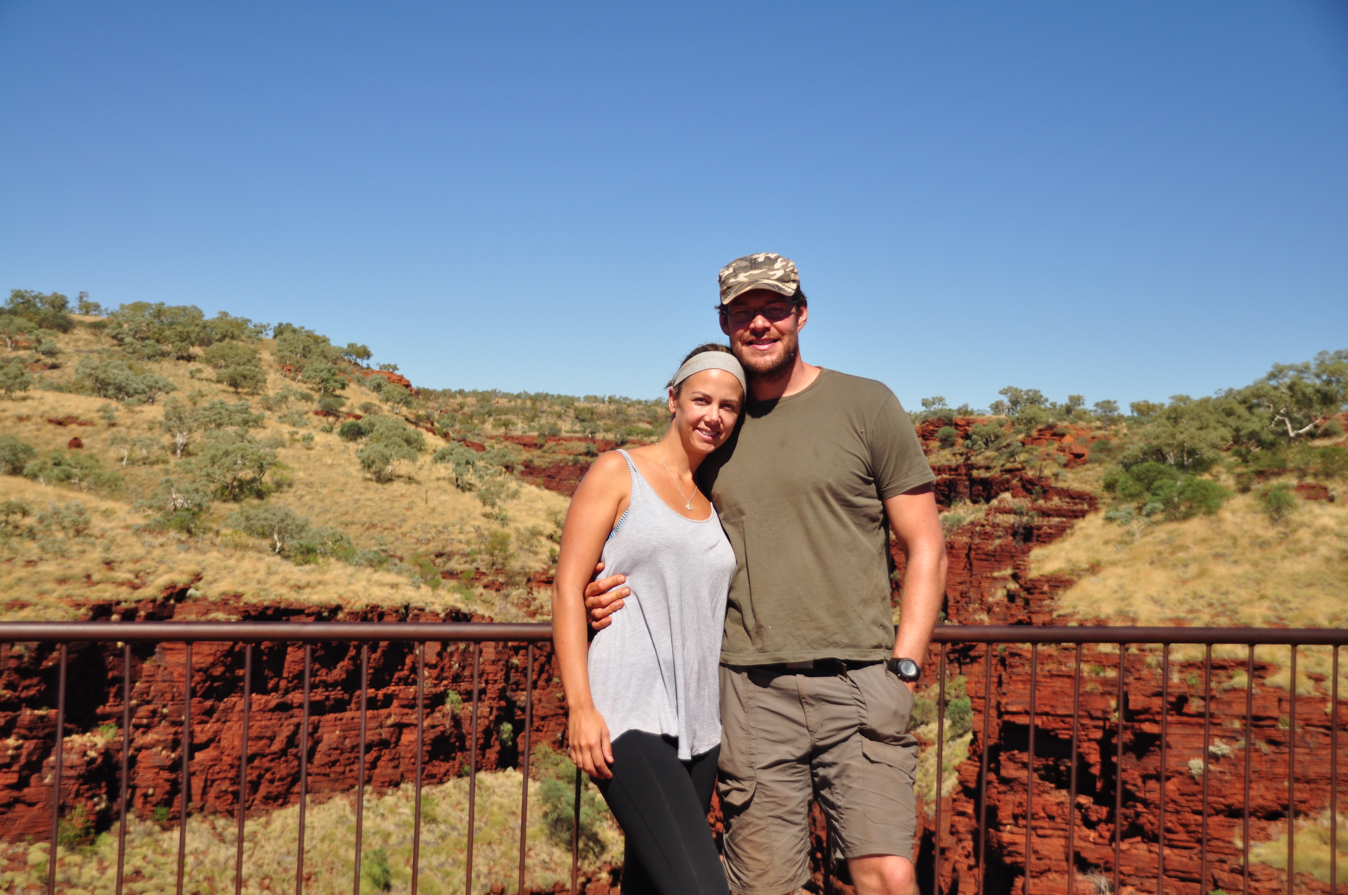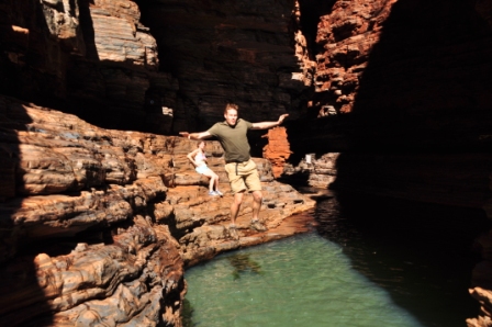 The drive to Karijini isn’t pleasant – unfortunately outside the paradise of the national park the surrounding areas are all big iron ore mining areas. The huge road trains thunder up and down the highway and with their speed firmly set at 110km/hr, they are very intolerant of cruisey travellers like us who bumble along at 90km/hr! Feeling rather harassed by the time we turned into the park we were relieved to find a camp spot at Dales Gorge campsite inside the sanctuary of Karijini. The park is famous for it’s deep gorges, waterfalls and swimming holes and we spent the next couple of days getting our fix of all 3. The highlight had to be walking into Hancock Gorge as the rain the previous day meant there was more water in there. There were sections where we had to take our boots off and paddle through, but each section seemed to get deeper and deeper until we had to ditch all of our gear on a rock ledge and swim for it. At the end we had to scramble down waterfalls into the bottom of the gorge to get to a deep swimming hole. It was so stunning that Rich went back for the camera which he then had to swim back with one arm holding the camera up in the air and out of the water. Really should have got a Go Pro before we left!!