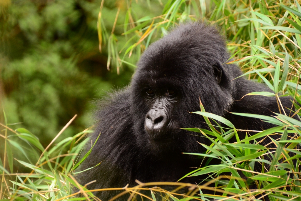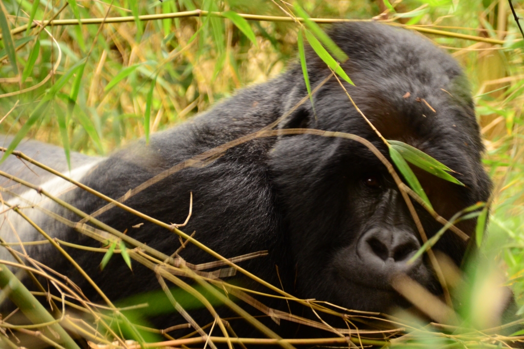 We were given a quick briefing, before taking the final couple of hundred meters to where the gorillas were feeding. As we approached the trackers began their grunting calls to the gorillas and within seconds the gorillas responded with grunts and yelps to tell the whole family of our approach. As we rounded the corner, there in front of us was a huge Silverback starring straight back at us. To see such a huge animal, only meters away, with no fence inbetween, was incredible. My heart was almost pounding out of my chest! The silverback looked unimpressed, realising it was only humans and nothing to worry about, he moved off slowly into the thick undergrowth, so the guide took us forward slowly to begin following them. As we got to where the Silverback had originally been standing, we looked around to see that the entire family were all feeding around us. We sat and watched as two females and their babies, one of which was only 2 days old, munched their way through the bamboo canes only feet away from us.