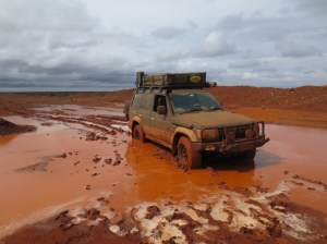 We continued slowly, but were soon at a standstill once more as we came to another huge pool of water which had claimed its first victim of the day. A Landcruiser troop carrier had become bogged in the middle, blocking the road. There was no way round and the car, filled with road workers had decided to abandon the car in the middle leaving the main route blocked. The workers came over to us and said we should try driving up onto the embankment, where the foundations of the new road were going in, from there we would be able to drive round and rejoin the track further up. We took their advice and turned around, driving back down the track trying to find a clear route up onto the embankment. Rich got out and walked the area between the track and the embankment, it was soft, soft clay but with rocky sections so we thought we’d give it a go. As we drove off the track, the soft clay began to take hold of the wheels and it needed a lot of momentum to keep the car from sinking down. We soon realised that this was not a good idea, but just hoped if we were able to get up onto the embankment, the surface would be more hard packed and easier to drive on. With foot to the floor, we sped the car up the side of the embankment and onto to the top, but as soon as we onto the top, what looked like hard-packed surfaced was just more soft clay – shit, this was a really bad idea! We kept going for as long as possible, but as we hit yet another large pool of water, the inevitable happened and the car sunk lower and lower before grinding to a complete stop. We were now stuck in about a foot of muddy water and far from the beaten track. It was time to get digging. Rich got to work trying to remove mud from under the wheels so that we could get our Maxtrax (sand/mud ladders) under the wheels to create some traction. Digging Kylie out of this on our own, without help was going to take all day. But with no other option available at that point, we had to keep digging. After about an hour of trying different things and desperately trying to keep frightening thoughts of being stranded here for days at bay, I heard the sound of another car driving up the track below us. Without a second thought I began running, slipping, sliding through the mud to try and get down the car before he passed by. The old 60 series Landcruiser had managed to find a way round the other stricken cruiser and was heading our way. I skidded down the embankment and ran towards the car waving frantically. It must have been quite a sight for the car’s 5 occupants to see a lone white female, covered head to toe in mud running towards them. Thankfully they stopped! I explained our predicament and they also said they’d tried to follow our tracks onto the embankment but had got stuck. I asked, then begged and pleaded with them to come and pull us out – initially reluctant to come to our rescue due to realising how soft the ground was where we were stuck, I was able to reassure them by showing that the 2 roads were almost joining up just ahead, so it would be easy for them to drive round to where we were. They agreed! A huge wave of relief swept over me, we were saved! I directed them round to where Kylie sat looking sorry for herself and Rich, not having seen where I’d run off to, was relieved to see me arrive with back up. The men got out of the car, but as Henry (the driver) reversed the car round to line up with ours he managed to slip straight into another pool of water, also bogging his car right up to the chassis. Great, our rescue attempt was looking like it was over before it had begun – the other guys were also not looking impressed. So it was all hand on deck to try and rescue the Cruiser first. We all began to dig, push, bounce the Landcrusier until we get its wheels onto the Maxtrax – it was sheer brute force with everybody pushing but we finally got the back wheels to grip and force the car out the muddy predicament. Huge cheers erupted as we got the first car out and the stern faces began to smile again. To keep their vehicle clear of the mud, we looped together 3 snatch straps and attached it to Kylie and as soon as the cruiser had regained some grip he was able to pull our old girl out with no problem. With both cars freed, we made our way back to the track. A lesson learned – never, ever leave the main track!!!