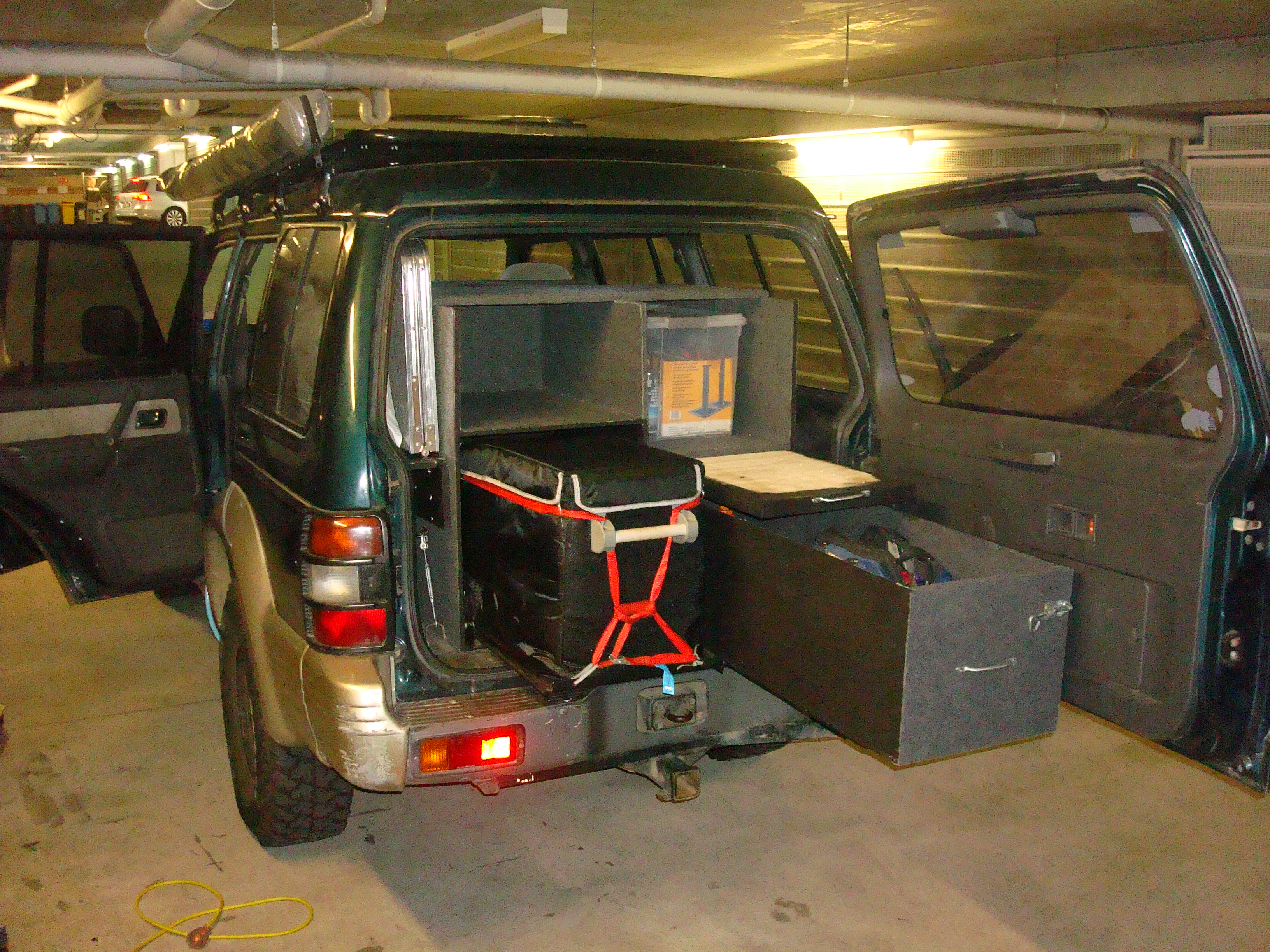 – Home made rough storage system in boot including a home made fridge slide and drawer